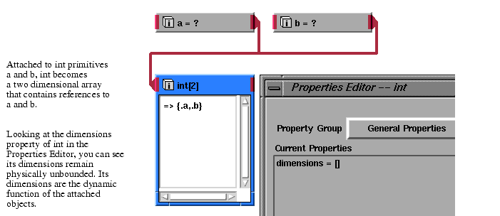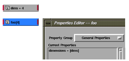 Such an object will automatically take on the dimensions of any array of values placed in foo. For example, if foo is set to equal {1,2,3,4,5}, the dimensions of foo will dynamically be set to [5], although the dimensions property is still seen to be unbounded when viewed in the Properties Editor.