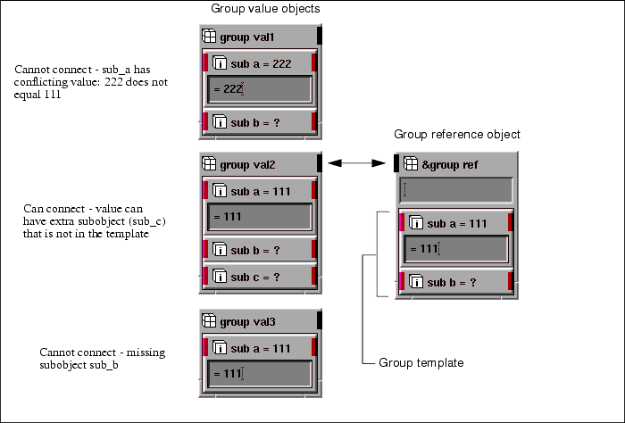 For the group value to match the template, it must have all the subobjects that the template has. Further, if any of the primitive data subobjects of the template have a value, the group value's subobject cannot have a conflicting value to match the template. For example, in the following figure the three groups on the left are defined by-value and the one on the right is by-reference. The by-reference group can only connect to the group value in the middle: