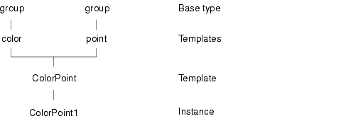 color1's type is color, so color1 inherits color's definition: it too is a group and it too has subobjects red, green, and blue.