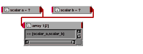 An array object can either have a single connection that points to an array object of the same dimensionality, or the array object can have a list of connections to either scalar objects or array objects that have one less dimension. For example, an array of size two is created from two scalars using