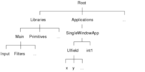 The figure below illustrates a portion of the object hierarchy. Assume for this example that the current application is SingleWindowApp and that you have instanced two objects in it, UIfield and int1.