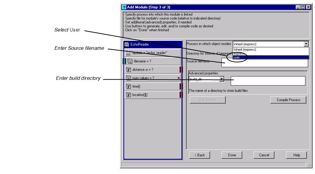 Workspace 1, the library where you placed EchoReader, is set up so that modules compiled in it belong by default to the express process. But you cannot compile the express process when you are in AVS/Express because the express process is running. So if you want to compile EchoReader within AVS/Express, you need to specify that EchoReader belongs to an external process. AVS/Express provides one, called user.