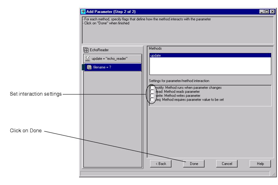 You use this page to assign attributes that define the interaction between the selected parameter and the method you select in the upper panel. In the current example, update is the only method and so is automatically selected.