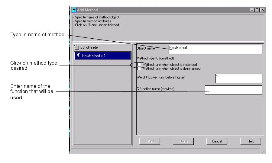 - This puts you into the screen where you can add a method object, identified by the lightning-bolt icon. You use a method object to associate EchoReader with a C routine.