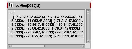 - All subsequent numbers are the actual data points. Each data point has three components: time in seconds (0.0133), longitude (-71.1667), and latitude (42.8333).