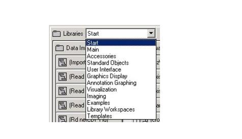 When you start AVS/Express, the Start library page is displayed in the Network Editor. You can display other library pages by using the Libraries drop down menu.