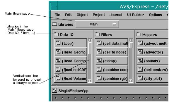 To help you navigate through the AVS/Express objects, they are organized into libraries and sublibraries. The listing of the contents of a particular library in the Network Editor is called a library page. When you start AVS/Express, the Main library page is displayed. It contains high-level objects that enable you to readily construct visualization applications. As on other library pages, the objects in the Main library are catagorized and then oranized into sublibraries. In the case of the Main library page, these sublibraries include: Data IO, Filters, Mappers, Geometries, and so on. The folder icon is used to represent a library or sublibrary.