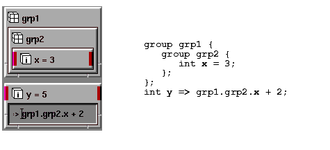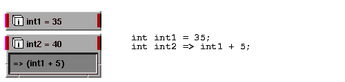 You can make connections between two objects using a value expression rather than making this connection by visually connecting two icons using the Network Editor. You do this by entering a value expression using the => operator. For example, by entering the value expression int1 into the int2 object, you are able to make this object connect to int1: