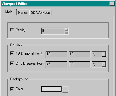 Editing a ViewportEach object in Gsharp has a number of resources associated with it. For example a viewport's resources include its position, its color, and its frame width (normally 0). Most of these resources have default values so you do not need to set them. Resources can be set in the resource editor. There are several ways to display the resource editor but one of the easiest is to double click on the object with MB1. Double click on your selected viewport. A resource editor appears containing the resources for your viewport.