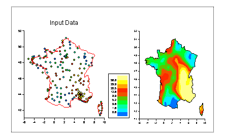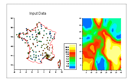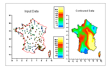 Interpolation and ContouringIn order to create a contour plot Gsharp requires the data to be a two dimensional grid. If our input data is in irregular scatter format then we can use an interpolation method to calculate a grid from it. There are two methods of interpolating from scattered data to grid data: