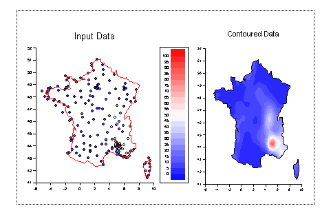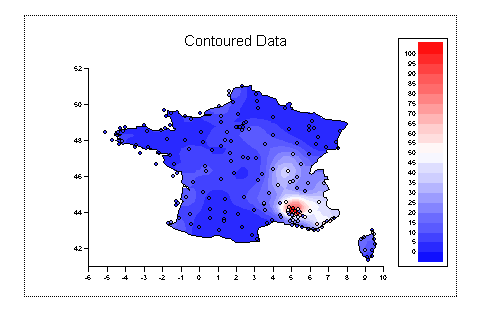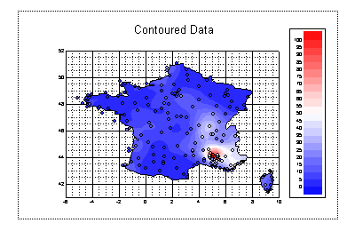 Our one viewport now contains both domains on top of each other. On this occasion both domains have the same limits, but when combining graphs like this you should normally ensure that both domains have the same limits, so that a point in the scatter domain corresponds to a point in the contour domain. It is not possible to have a scatter graph and a contour plot in the same domain which is why we have to use two and then ensure they are in sync. As our X and Y data is in degrees of latitude and longitude there is a relationship between them. If we use the cylindrical equidistant projection than we should ensure that 1 degree of latitude equals one degree of longitude. The simplest way to do this is to set the ratio of the X axis to the Y axis to be 16:11 (the range of the x axis is 16 degrees and the y axis 11 degrees). Edit the viewport and under the ratio tag set X ratio to be 1.6 and Y ratio to be 1.1 Finally edit the domain and under Switches turn on ticklines behind the contour: